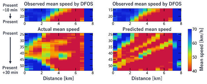 為應(yīng)對(duì)上述挑戰(zhàn),NEC 研發(fā)出新方案:將原本沿道路鋪設(shè)、用于通信的光纖線纜轉(zhuǎn)化為大規(guī)模分布式傳感器,實(shí)時(shí)、連續(xù)地采集整條線路的交通流數(shù)據(jù);隨后,由 NEC 獨(dú)有的 AI 驅(qū)動(dòng)模型給出突發(fā)擁堵形成與消散的高精度實(shí)時(shí)預(yù)測(cè)。