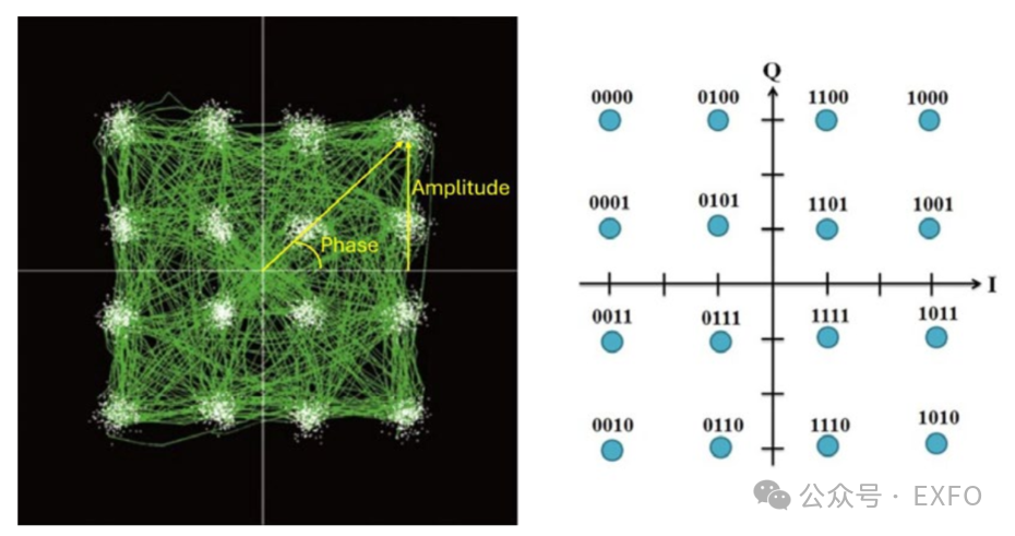 除了調(diào)制,偏振在相干傳輸中也起著關(guān)鍵作用。光經(jīng)過(guò)偏振,這意味著其電場(chǎng)在特定方向上振蕩。通過(guò)在兩個(gè)正交偏振(垂直和水平)上對(duì)獨(dú)立的數(shù)據(jù)流進(jìn)行編碼,偏振復(fù)用可將傳輸容量翻倍。圖4顯示的是16 QAM相干信號(hào)星座圖。