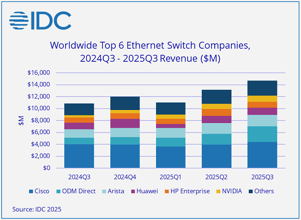 ICC訊 —— 國際數(shù)據(jù)公司(IDC)最新發(fā)布的《季度以太網(wǎng)交換機(jī)跟蹤報告》和《季度路由器跟蹤報告》顯示,2025年第三季度(3Q25),全球以太網(wǎng)交換機(jī)市場收入達(dá)到147億美元,較去年同期增長35.2%。這一強(qiáng)勁增長主要由市場的數(shù)據(jù)中心部分驅(qū)動,因?yàn)槌笠?guī)模企業(yè)和云服務(wù)提供商競相為AI時代構(gòu)建基礎(chǔ)設(shè)施容量。與此同時,2025年第三季度全球企業(yè)和服務(wù)提供商(SP)路由器市場總額同比增長15.8%,達(dá)到36億美元。