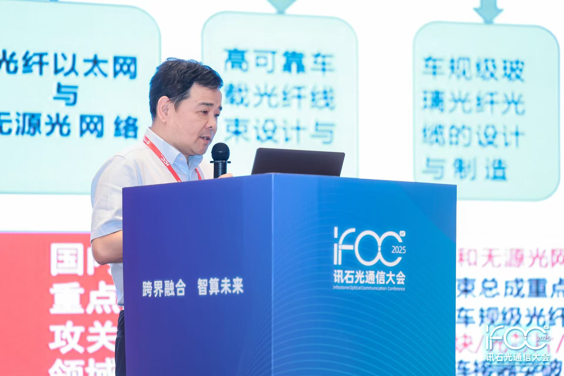 烽火通信技術(shù)研究中心總經(jīng)理羅文勇則在《車載光通信技術(shù)發(fā)展與展望》中,直面車載通信網(wǎng)絡(luò)的升級需求與中國產(chǎn)業(yè)機遇。他指出,智能網(wǎng)聯(lián)汽車的快速演進使傳統(tǒng)銅纜在帶寬、重量、成本上的瓶頸日益凸顯,車載光纖通信成為破局關(guān)鍵;依托國內(nèi)光纖到戶的產(chǎn)業(yè)規(guī)模與技術(shù)優(yōu)勢,發(fā)展車載PON、推進以V-PON為核心的“光進銅退”方案具有重要現(xiàn)實意義。同時,他還提出V-PON技術(shù)需突破車規(guī)級無源器件、光芯片研發(fā)等關(guān)鍵領(lǐng)域,并建議加強跨領(lǐng)域協(xié)作與標準統(tǒng)一。此外,其還分享了中國信科集團的全棧技術(shù)布局,以及烽火通信聯(lián)合光迅、信科智聯(lián)等企業(yè)構(gòu)建“光-芯-網(wǎng)-端”生態(tài)的進展,包括國內(nèi)首款Risc-V車規(guī)MCU芯片與車載PON系統(tǒng)原型的推出,凸顯中國企業(yè)在該領(lǐng)域的技術(shù)實力。