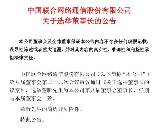 ICC訊 日前,中國聯(lián)通發(fā)布公告,宣布公司第八屆董事會第二十二次會議審議通過《關(guān)于選舉董事長的議案》,選舉董昕為公司第八屆董事會董事長,任期與本屆董事會一致。