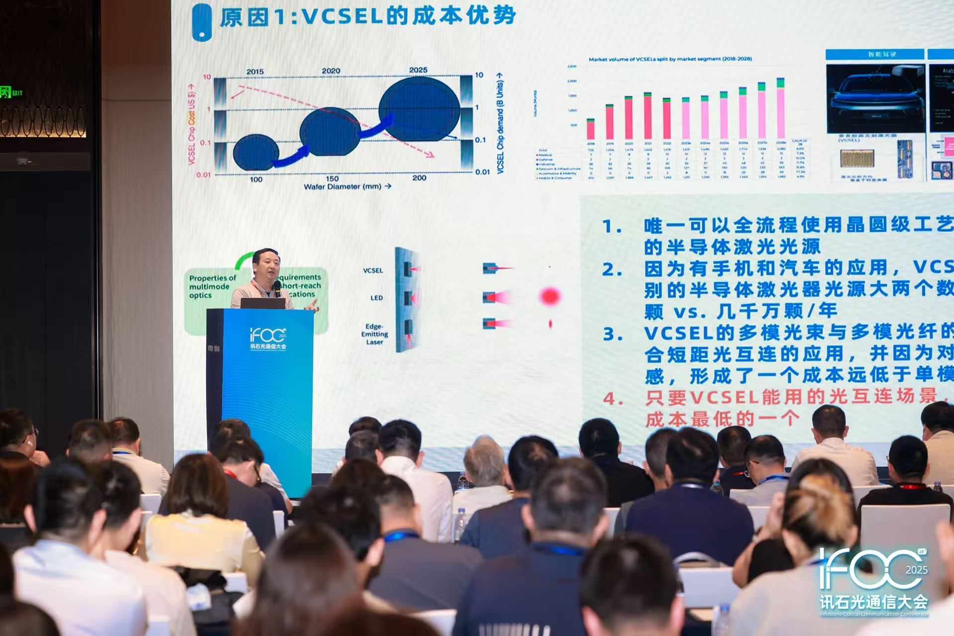 老鷹半導(dǎo)體首席科學(xué)家莫慶偉的《面向下一代智算中心短距光互連的VCSEL技術(shù)及其發(fā)展趨勢》主題演講,聚焦短距光互連領(lǐng)域核心技術(shù)。他指出,基于VCSEL的短距多模光互連,憑借性價(jià)比和能耗的顯著優(yōu)勢,一直是智算中心主要的光傳輸解決方案;而隨著VCSEL技術(shù)持續(xù)演進(jìn)與突破,其在Scale Up、Scale Out及可插拔、LPO、CPO、OIO等場景中,將繼續(xù)獲得廣泛關(guān)注與應(yīng)用,為短距光互連發(fā)展注入持久活力。其在演講中介紹老鷹半導(dǎo)體公司在VCSEL領(lǐng)域的重要進(jìn)展,并表示公司已實(shí)現(xiàn)100G VCSEL技術(shù)量產(chǎn)。