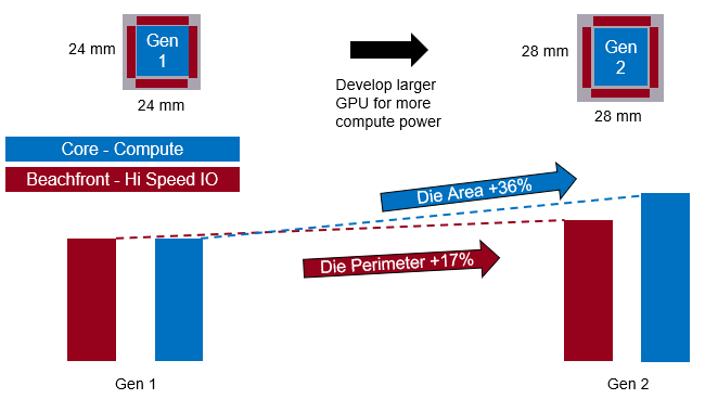 對(duì)更高速帶寬的迫切需求,直接源于 GPU 本身的演進(jìn)及其與芯片機(jī)械結(jié)構(gòu)之間的關(guān)系。隨著算力需求不斷膨脹,為了塞進(jìn)更多計(jì)算電路,GPU 的芯片尺寸被推向極限,在某些情況下已達(dá)到約 800 mm2 的光罩極限尺寸。如今,GPU 更是以成千上萬、乃至數(shù)萬顆的規(guī)模組成集群,這意味著巨量數(shù)據(jù)必須通過位于芯片四周——即所謂“beachfront”——的高速 IO 接口流出芯片。問題隨之而來:當(dāng)芯片面積增大時(shí),計(jì)算資源隨面積成比例增長(zhǎng),而高速 IO 資源卻只能沿著周長(zhǎng)增加,這就是著名的 beachfront 瓶頸。