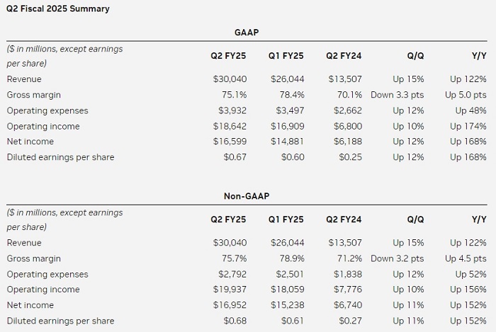 ICC訊 2024年8月28日,英偉達(dá)(NVIDIA)(納斯達(dá)克:NVDA)今天公布了其截至2024年7月28日的2025財年第二季度財務(wù)業(yè)績。