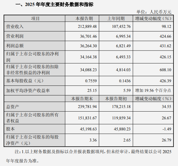 根據(jù)未經(jīng)審計的初步核算數(shù)據(jù),2025年度仕佳光子營業(yè)利潤為36,701.46萬元,同比增長424.66%;利潤總額為36,264.30萬元,同比增長431.62%。歸屬于上市公司股東的扣除非經(jīng)常性損益的凈利潤為34,088.23萬元,同比增長608.10%?;久抗墒找孢_(dá)到0.7559元,較上年同期的0.1436元增長426.39%。加權(quán)平均凈資產(chǎn)收益率為25.15%,較上年同期增加19.56個百分點。
