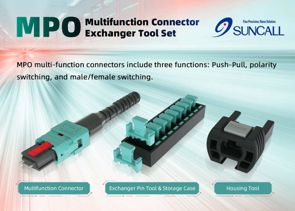 MPO 多功能連接器在高密度的應(yīng)用場景中,無需拉杠與專用工具,僅通過推拉尾套即可輕松完成插拔操作;無需拆卸外殼,便能快速實現(xiàn)極性互換,大幅提升產(chǎn)品的靈活適配性;此外,借助 Suncall 專用工具,還可快速便捷地完成公母頭切換。