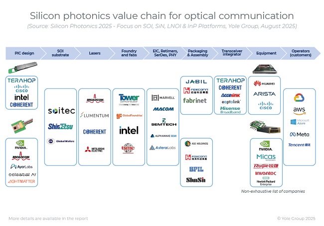 整個產(chǎn)業(yè)生態(tài)正圍繞多元化參與者形成:包括垂直整合巨頭(如旭創(chuàng)、思科、Marvell、博通、Coherent、Lumentum、新易盛)、初創(chuàng)企業(yè)/設計公司(Xphor、DustPhotonics、NewPhotonics、OpenLight、POET Technologies、Centera、AyarLabs、Lightmatter、Lightelligence、Nubis Communications)、研究機構(如加州大學圣塔芭芭拉分校、哥倫比亞大學、斯坦福工程學院、麻省理工學院)、代工廠(如Tower Semiconductor、GlobalFoundries、英特爾、AMF、imec、臺積電、CompoundTek)以及設備供應商(如應用材料、ASML、Aixtron、ficonTEC、Mycronic Vanguard Automation、Shincron)。所有這些參與者共同推動著產(chǎn)業(yè)的顯著增長與多元化發(fā)展。
