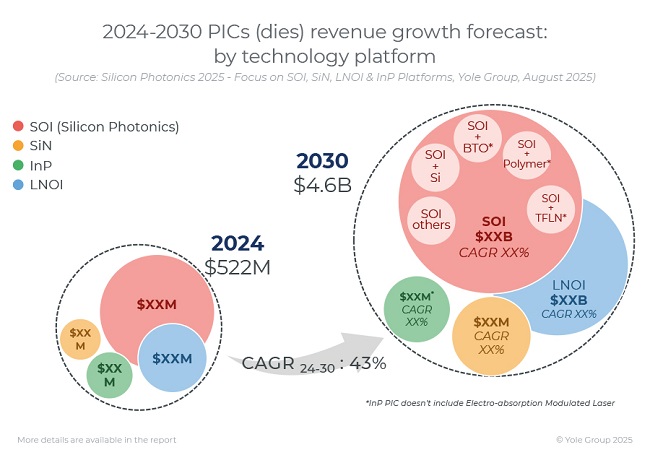 ICC訊 Yole發(fā)布最新報告稱,硅光子技術正驅動超高帶寬升級和人工智能網(wǎng)絡擴展,其市場規(guī)模預計將從2024年的2.78億美元增長至2030年的27億美元,年復合增長率高達46%。