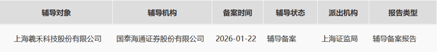 ICC訊 2026年1月23日,證監(jiān)會官網(wǎng)IPO輔導(dǎo)公示系統(tǒng)顯示,上海羲禾科技股份有限公司(簡稱“羲禾科技”)向上海證監(jiān)局提交IPO輔導(dǎo)備案,輔導(dǎo)券商為國泰海通。