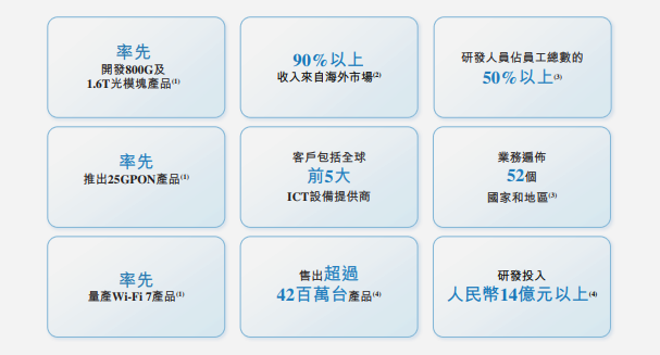 業(yè)務方面,劍橋科技是全球少數(shù)同時提供光通信、寬帶及無線技術(shù)相關連接解決方案的公司。在寬帶產(chǎn)品領域,公司的XGS PON產(chǎn)品在全球10GPON市場份額超過30%,并率先實現(xiàn)25GPON量產(chǎn)和50GPON部署。無線產(chǎn)品方面,公司全球首發(fā)Wi-Fi 7產(chǎn)品,并與Google Fiber合作推出業(yè)界首款20G上行Wi-Fi 7網(wǎng)關。光模塊產(chǎn)品覆蓋100G至1.6T互連速度,是全球首批部署800G和1.6T光模塊產(chǎn)品的企業(yè)之一。