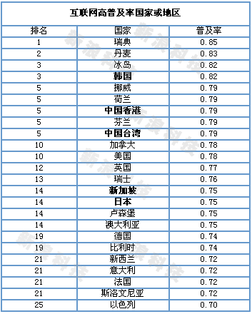 ITU全球互聯(lián)網(wǎng)普及排名,此表為互聯(lián)網(wǎng)高普及率排名(表中加粗的為亞洲國(guó)家或地區(qū))