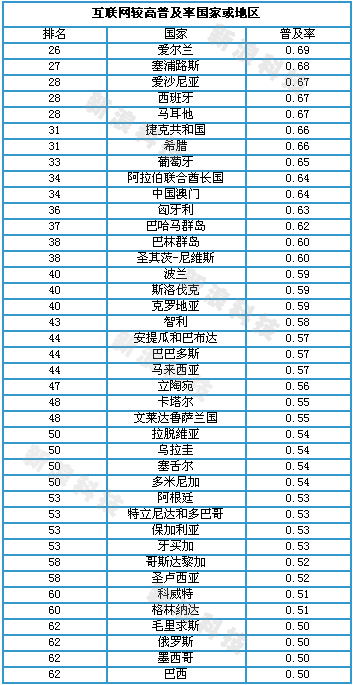 ITU全球互聯(lián)網(wǎng)普及排名,此表為互聯(lián)網(wǎng)較高普及率排名