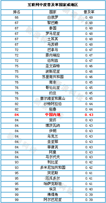 ITU全球互聯(lián)網(wǎng)普及排名,此表為互聯(lián)網(wǎng)中等普及率排名(中國(guó)內(nèi)地列84位)