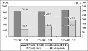在本地通話方面,固定電話通話量與移動(dòng)電話通話量的比從2002、2003年同期的2.92、2.22下降到1.69,移動(dòng)電話對(duì)固定電話的競(jìng)爭(zhēng)力度越來(lái)越大。