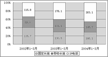 在長(zhǎng)途通話方面,IP電話所占的比重繼續(xù)增大,對(duì)傳統(tǒng)長(zhǎng)途電話的分流作用日益明顯。