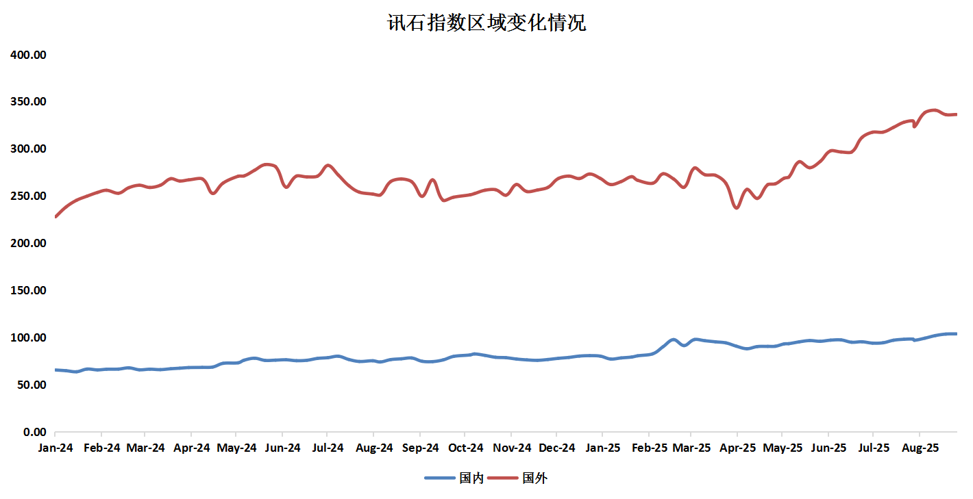 按地區(qū)劃分,截止到8月29日,ICC所統(tǒng)計(jì)的國(guó)內(nèi)通信指數(shù)為103.64,環(huán)比增長(zhǎng)5.7%。國(guó)內(nèi)指數(shù)在平緩中呈現(xiàn)小幅增長(zhǎng)趨勢(shì)。國(guó)外通信指數(shù)為336.22,較上月增長(zhǎng)2.09%。國(guó)外股指在波折中,呈現(xiàn)向上增長(zhǎng)的趨勢(shì),增長(zhǎng)趨勢(shì)放緩。