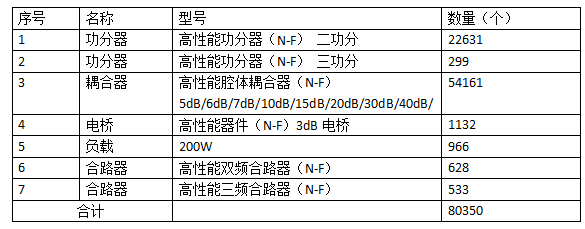采購內(nèi)容:本期建設(shè)室分RRU信源8035個,采購室分無源器件80350個,涵蓋功分器、耦合器、電橋、負(fù)載及合路器五大類、九種規(guī)格。其中,高性能耦合器需求最為旺盛,采購量達(dá)54 161個;高性能二功分器緊隨其后,需求22 631個;三功分器、電橋、負(fù)載、雙頻及三頻合路器亦在采購清單之列,數(shù)量從299至628個不等。具體采購預(yù)算112.86萬元(不含稅),有效期半年。具體采購情況,如表所示: