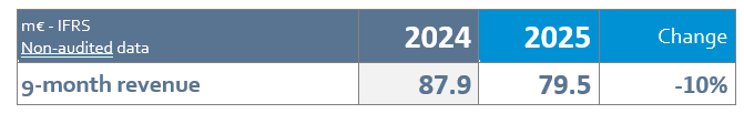 2025年前三季度,累計(jì)營(yíng)收7950萬歐元,同比下降10%(按固定范圍和匯率計(jì)算為-11%)。Olfeo在此期間貢獻(xiàn)210萬歐元。