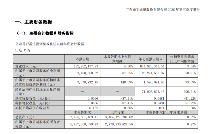 文章標(biāo)題:通宇通訊2025年三季度凈利潤(rùn)降87.3%至349萬元