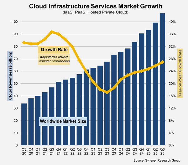 ICC訊 來自Synergy研究集團(tuán)的最新數(shù)據(jù)顯示,2025年第三季度,企業(yè)在云基礎(chǔ)設(shè)施服務(wù)上的支出較上一季度猛增超過75億美元,這是迄今為止最大的環(huán)比增幅。在剔除了該期間一些主要貨幣波動(dòng)的影響后,這一數(shù)據(jù)較去年第三季度增長了28%,標(biāo)志著同比增長率連續(xù)第八個(gè)季度上升,同時(shí)也是該市場三年來最高的增長率。