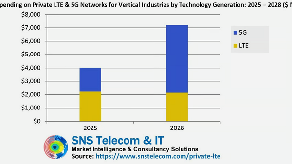ICC訊 市場研究公司SNS Telecom & IT在其第四季度市場報告中指出:“2025年是私有LTE/5G市場的轉(zhuǎn)型之年,5G部署在許多垂直行業(yè)已超越LTE。”該公司表示:“我們預(yù)計,2025年至2028年間,全球垂直行業(yè)私有LTE和5G網(wǎng)絡(luò)基礎(chǔ)設(shè)施支出將以約22%的年復(fù)合增長率(CAGR)增長,到2028年底最終將超過72億美元?!?