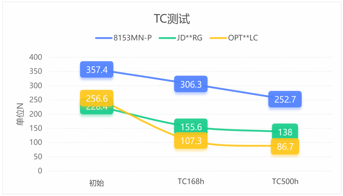 8153MN-P在雙85@1000h和TC@500h可靠性后力值保持率遠(yuǎn)高于市場同類競品