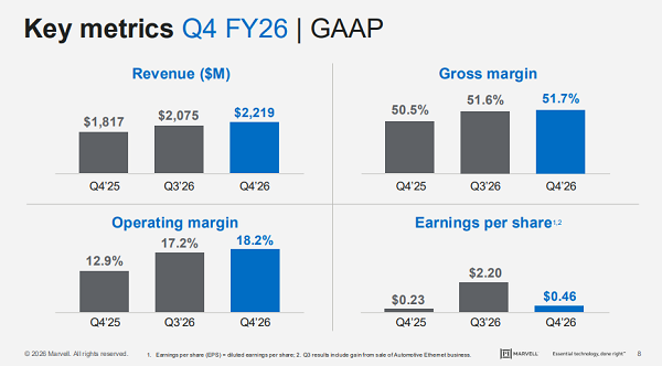 ICC訊 數(shù)據(jù)基礎(chǔ)設(shè)施半導(dǎo)體解決方案領(lǐng)軍者Marvell Technology, Inc.(納斯達克:MRVL)于2026年3月5日公布了截至2026年1月31日的第四財季及整個財年的財務(wù)業(yè)績。