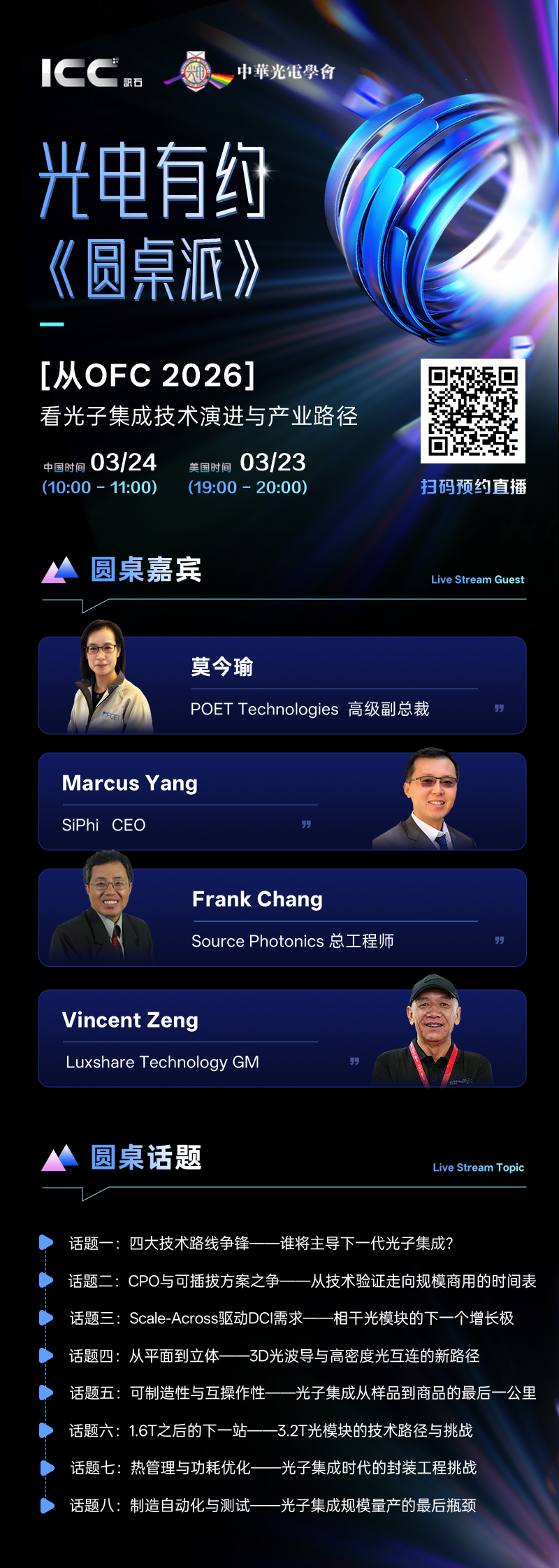 3月24日,ICC訊石光電有約將舉辦主題為“從OFC 2026看光子集成技術(shù)演進(jìn)與產(chǎn)業(yè)路徑”的《圓桌派》節(jié)目,邀請(qǐng)行業(yè)嘉賓一起探討OFC 2026上光子集成的創(chuàng)新展示和突破性應(yīng)用,以及未來(lái)的發(fā)展等。歡迎大家掃碼關(guān)注直播。